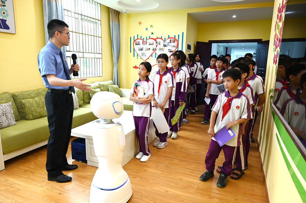 上午,30名学生代表如约走进我院“七色花”未成年人检察工作室,同学们好奇地打量着迎接他们的智慧检务机器人“小埔”,并向它提出各种各样的问题。“小埔”耐心地解答同学们的提问,详细介绍了“七色花”未成年人检察工作室的由来,还带领同学们参观了整个工作室。在讯问室,一名同学好奇地问道:“这里的讯问室跟我电影上看到的不一样,讯问的桌子为什么是圆的?”“未成年人讯问室色彩明亮温馨,使用圆桌,是为了最大限度地减轻涉案未成年人的恐惧和抵触心理……”检察官向同学们解说道。